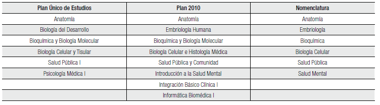 Tabla 1. Asignaturas del Plan Único de Estudios y del Plan 2010 de primer año de la licenciatura de