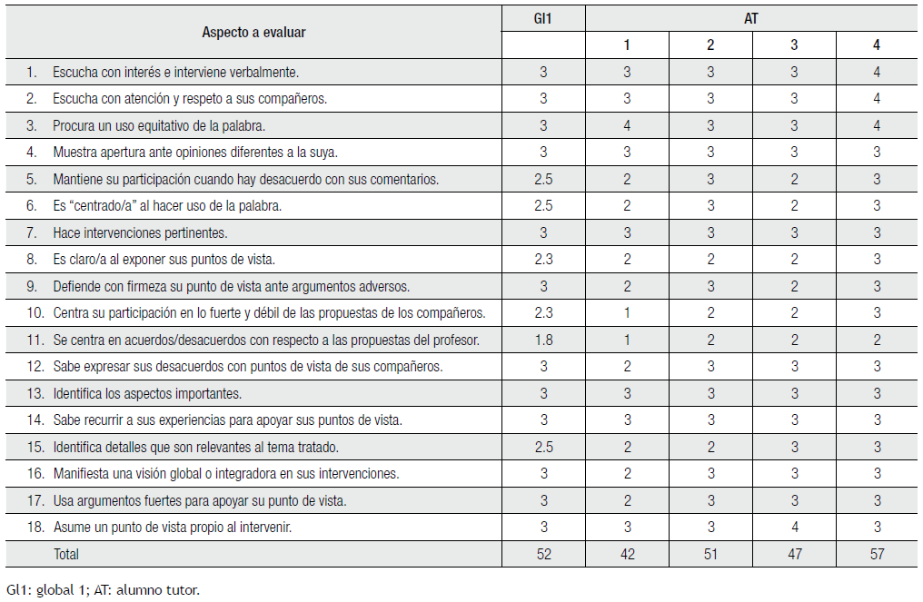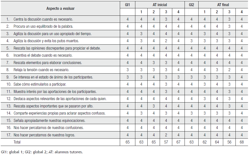 Tabla 2. Resultados finales de la evaluación de los estudiantes otorgados por los alumnos tutores en la discusión grupal al término del curso,