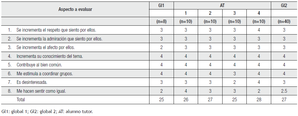 En la autoevaluación de los alumnos tutores encontramos una idea muy clara de que esta labor mejoraría su habilidad docente, estimulándolos a continuar y con una gran satisfacción en una labor desinteresada, mejorando el afecto y refiriendo un trato igualitario a sus estudiantes (no percibido así por ellos).