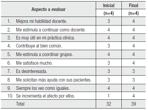 Cuando los estudiantes califican la utilidad de la actividad docente para los alumnos tutores, destacan el respeto y admiración que sienten por ellos, que va disminuyendo diferenciadamente en dos tutores e incrementada en los otros dos a medida que avanza el curso. Otros reportes enfatizan el aspecto afectivo incrementado de los alumnos tutores al constatar el avance de sus estudiantes, en una actividad considerada como un privilegio,27 en programas consolidados o de adiestramiento.28