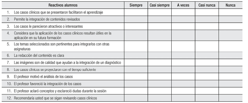Ambos cuestionarios contenían una escala de respuesta tipo Likert (siempre, casi siempre, a veces, casi nunca, nunca). Los instrumentos se aplicaron a los grupos participantes, al final del segundo caso clínico, los que se contestaron de forma anónima.