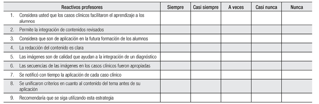 No se encontraron cuestionarios relacionados con el tema en la literatura publicada, por lo que se elaboraron dos cuestionarios que contribuyeran a indagar la satisfacción con la herramienta didáctica de caso clínico. Se elaboraron 30 reactivos basados en la literatura de Evaluación del Aprendizaje,11 de las cuales se seleccionaron 12 reactivos para el cuestionario de los alumnos (Tabla 1); y nueve reactivos para el cuestionario de los profesores (Tabla 2). Hay una diferencia en el número de reactivos en los profesores, que se debió a que en la generación 2009-2010, el instrumento contaba con un reactivo que lo relacionaba con una entidad infecciosa, el cual no se aplicó en la generación 2011-2012, sin efecto en el análisis de los datos.