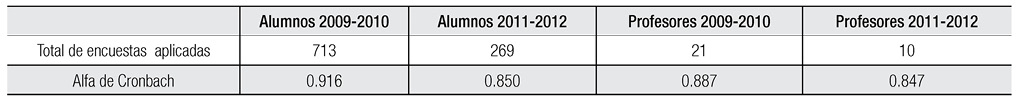 El nivel de confiabilidad de ambos instrumentos y la cantidad de los alumnos y profesores en quienes se aplicaron los instrumentos se muestran en la Tabla 3.