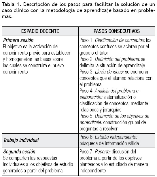 El proceso comprende siete pasos (según la escuela de Maastricht), en al menos dos sesiones de aula y una de trabajo individual (Tabla 1).2 El objetivo de este artículo es emitir algunas recomendaciones para mejorar el desempeño del tutor, ya que gran parte del éxito del ABP depende de su actuación.