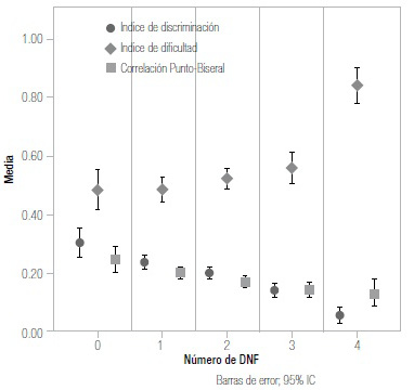 Figura 1. Valores promedio con IC 95% de índice de dificultad, índice de discriminación y correlación de punto-biserial, en cada grupo de ítems con diferente número de distractores no funcionales (DNF), en el Examen Profesional Teórico de la Facultad de Medicina de la UNAM, enero 2008.