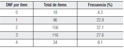 El número total de opciones del examen fue de 2 100, compuesto de 420 respuestas correctas y 1 680 distractores u opciones incorrectas. El 53.1% (892) de los distractores evaluados se clasificó como no funcional (DNF). Solamente 18 ítems (4.3%) tuvieron los cuatro distractores funcionales. Treinta y cuatro ítems (8.1%) no tuvieron ningún distractor funcional. El número de DNF por ítem fue de 2.12 ± 0.99 (media ± desviación estándar). Los resultados de frecuencia se presentan en la Tabla 1.