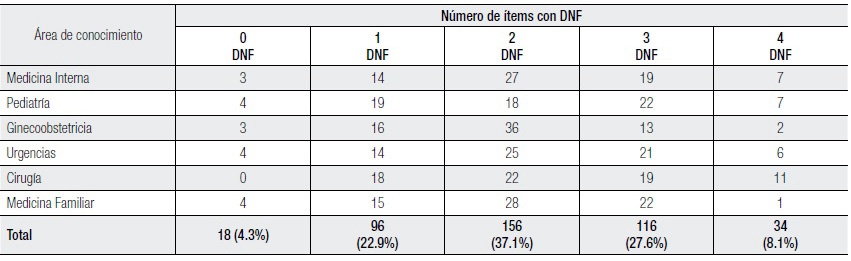 Al clasificar a los DNF, se encontró que 74% de ellos fueron elegidos por menos del 5% de los sustentantes, 36.4% fue respondido por 1% o menos de la población, 20% tuvo un índice de discriminación positiva y 6.1% no discriminó. Cinco áreas del examen contenían, por lo menos, tres ítems con ningún DNF y uno con cuatro DNF. El área de Cirugía, en contraste, tuvo el mayor número de ítems con cuatro DNF y ninguno con todos los distractores funcionales. El comportamiento de DNF en cada área de conocimiento se muestra en la Tabla 2.