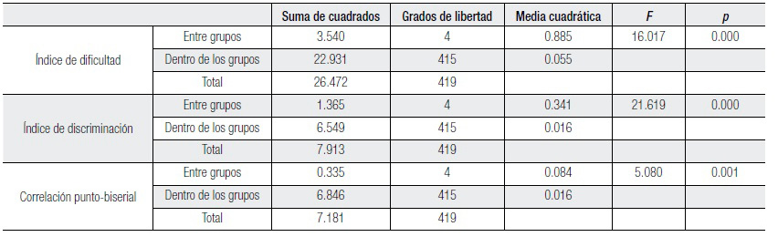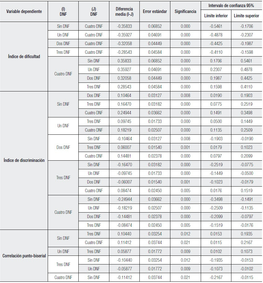 El ANOVA mostró diferencias estadísticamente significativas (p<0.001) en los indicadores psicométricos (índices de dificultad y discriminación, correlación de punto-biserial), entre los grupos de ítems con diferente número de DNF (Tabla 3). La prueba post-hoc de Tukey mostró diferencias significativas (p<0.001) en índice de dificultad y de discriminación entre ítems con cuatro DNF y los demás ítems con cero a tres DNF. Se encontró diferencia significativa en la correlación punto-biserial entre los ítems con cuatro DNF y el grupo con ningún DNF (Tabla 4).
