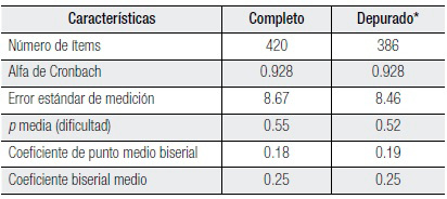 Tabla 5. Comparación de análisis de reactivos de la versión completa de la prueba con una versión depurada (sin los 34 ítems con cuatro DNF). Examen Profesional Teórico de la Facultad de Medicina de la UNAM, enero 2008.