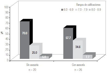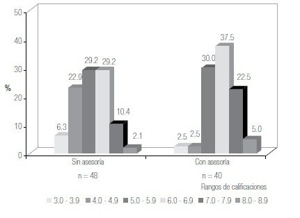 Figura 2. Distribución de calificaciones de los estudiantes en el examen extraordinario en función de la asesoría académica.