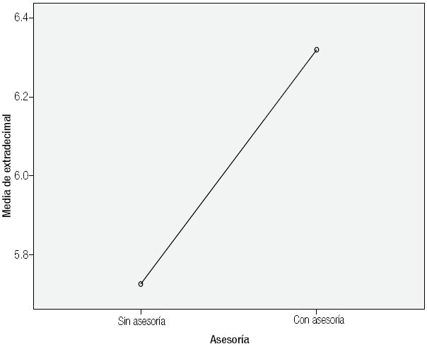 Estos datos permitieron aceptar la hipótesis alternativa y rechazar la hipótesis nula. En la gráfica de medias ( Figura 1 ), el grupo de alumnos que recibieron asesoría tuvo un mejor desempeño en el examen extraordinario que el de los que no recibieron dicho apoyo escolar.