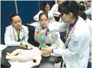 En el año 2009 la Facultad de Medicina de la UNAM adaptó, con permiso de los autores, parte del material del curso BEST (Bringing Education & Service Together)35,36 para implementar su propia versión del Taller "El Médico Residente como Educador".34 El programa BEST fue desarrollado por la Dra. Morrison y colaboradores, uno de los grupos más influyentes en el tema y con mayores referencias en la literatura del MRE.35,36 El Taller de la Facultad de Medicina de la UNAM consiste en una sesión presencial de medio día, con siete horas de actividades para seis sesiones: conceptos actuales del MRE; enseñanza clínica; enseñanza de procedimientos; cómo dar una conferencia; realimentación; liderazgo y manejo de conflictos.34 Se utiliza la estrategia educativa de taller, con sesiones didácticas interactivas y actividades prácticas en parejas y pequeños grupos, para lograr el aprendizaje significativo de los contenidos. En las Figuras 2 y 3 se muestran imágenes de la página de Internet y de una sesión práctica del Taller. Actualmente se desarrolla una versión en modalidad en línea, que permitirá un mayor alcance del mismo con las bondades inherentes a esta estrategia educativa.