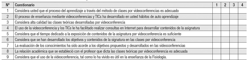 Los resultados obtenidos se muestran en la Tabla 2. Las cuatro puntuaciones más altas, en opinión de lo estudiantes, fueron: el 93.1% estuvieron "totalmente de acuerdo" y "de acuerdo" en la calidad de las clases teóricas desarrolladas en las videoconferencias; el 90% ("totalmente de acuerdo" y "de acuerdo"), consideró que el uso de la videoconferencia como lo habían vivido es útil en la enseñanza de la Fisiología; el 88.8% estuvo "totalmente de acuerdo" y "de acuerdo" en que la relación académica que se estableció con el profesor que impartió las clases fue adecuada; en relación con el desarrollo de objetivos, el 71.3% estuvieron "totalmente de acuerdo" y 13.5% "de acuerdo".