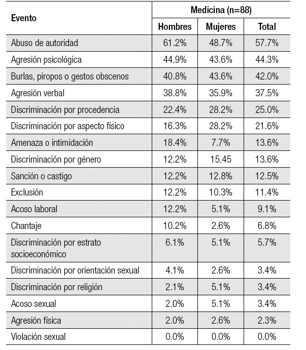 Resultados: El 86.4% de los estudiantes tienen antecedente de haber sido víctima de alguno de los siguientes eventos estudiados: discriminación por aspecto físico, procedencia, género, estrato socioeconómico, orientación sexual y religión; agresión verbal, física y psicológica; abuso de autoridad; acoso laboral; amenaza o intimidación; sanción o castigo; chantaje; burlas, piropos o gestos obscenos; exclusión y acoso sexual. Los tipos de violencia más frecuentemente reportados fueron abuso de autoridad y agresión psicológica.