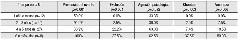 Se encontraron diferencias estadísticamente significativas en lo relacionado con el tiempo de estancia en la Universidad y la presencia del evento, exclusión, agresión física, chantaje y amenaza (Tabla 2).