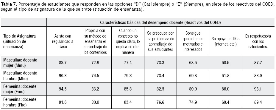 También en la Tabla 7 se muestran los porcentajes totales de estudiantes (hombres y mujeres), que responden ya sea en la opción "D" (casi siempre) o en la "E" (siempre), en los mismos siete reactivos del COED, según el tipo de asignatura o situación de enseñanza de la que se trate, conformando así la dimensión "Satisfacción General". Se observa que las profesoras que imparten clases en aquellas asignaturas, en donde los profesores son mayoría entre los docentes, obtienen comparativamente por parte de sus estudiantes, la menor valoración de su desempeño docente.
