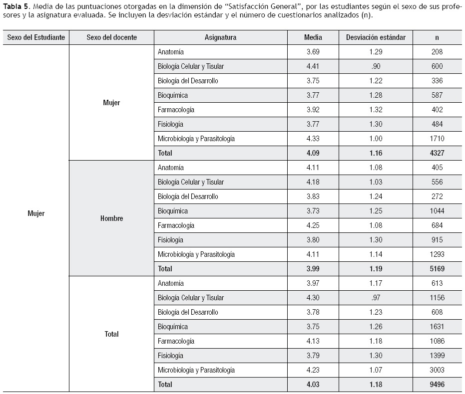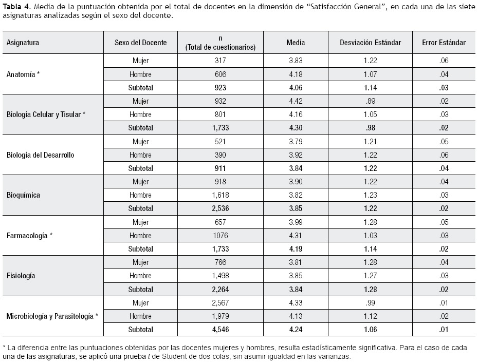 Las docentes tomadas como grupo, obtienen en comparación con los docentes, puntuaciones más altas, estas diferencias están determinadas por la asignatura de la que se trate, como se puede observar en la Tabla 4. En dos de esas asignaturas (Biología Celular y Microbiología), son las docentes mujeres quienes en la dimensión "Satisfacción General" son mejor valoradas que sus colegas hombres. En contraste, en dos asignaturas (Anatomía y Farmacología) son los docentes hombres, en promedio, mejor valorados que las docentes mujeres. En las otras tres asignaturas, las diferencias entre docentes mujeres y hombres no son significativas.