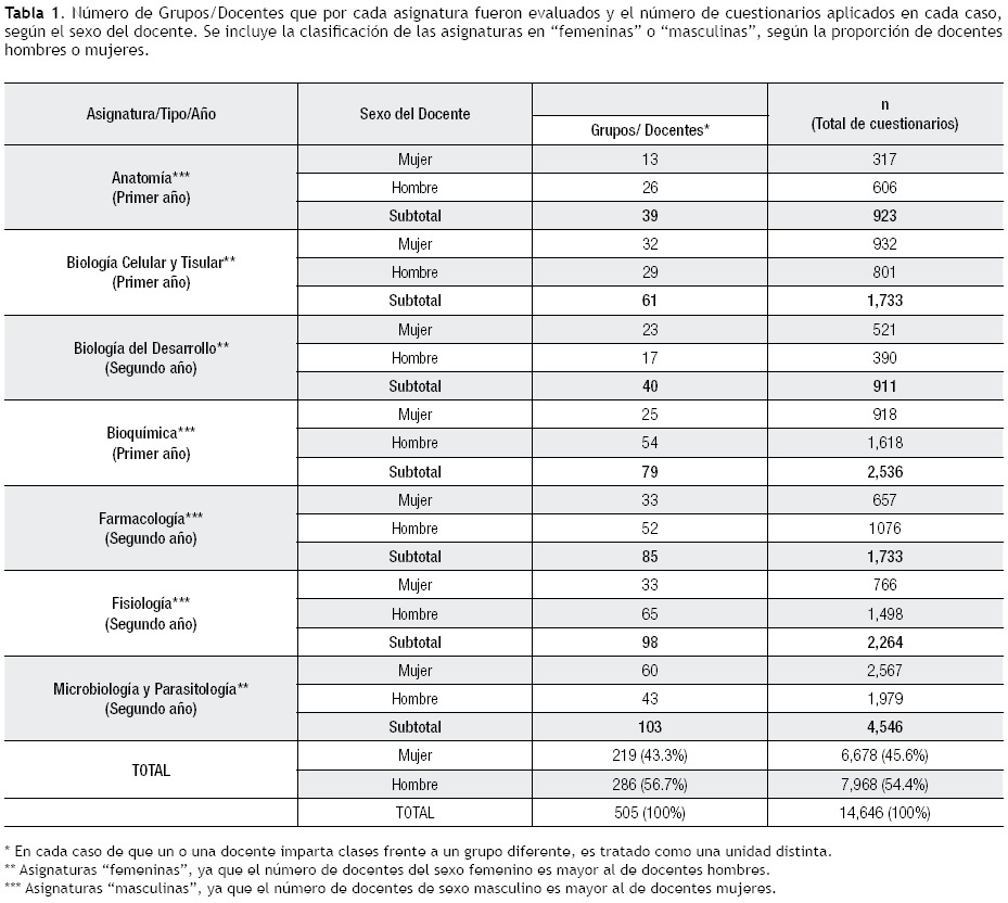 En las asignaturas en las cuales la docencia se organiza en términos de unidades temáticas (Bioquímica, Fisiología, Microbiología, Parasitología), el cuestionario se aplicó al término de cada una de estas unidades. En las otras cuatro (Anatomía, Biología Celular y Tisular, Farmacología, Biología del Desarrollo), el cuestionario fue aplicado al finalizar el ciclo escolar. En la Tabla 1 se muestran las asignaturas en las que el cuestionario fue utilizado, y en cada una de ellas se indica el año académico en el cual se imparte, el número de docentes evaluados según su sexo, total de grupos/docentes evaluados, cuestionarios aplicados y empleados en los análisis.