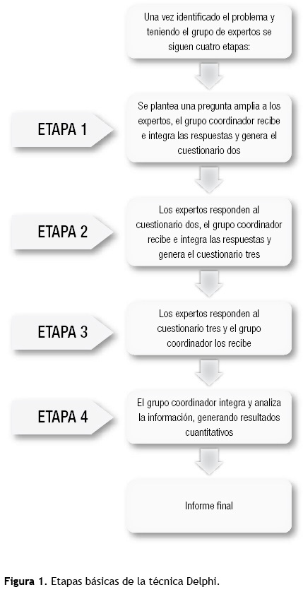 El método Delphi se clasifica como uno de los métodos generales de prospectiva, que busca acercarse al consenso de un grupo de expertos con base en el análisis y la reflexión de un problema definido. Este artículo tiene como propósito describir los antecedentes, exponer la definición y analizar sus características, aplicación y proceso metodológico. Además, se presentan sus diversos usos en investigación en las ciencias del área de la salud, así como sus principales ventajas y limitaciones.
