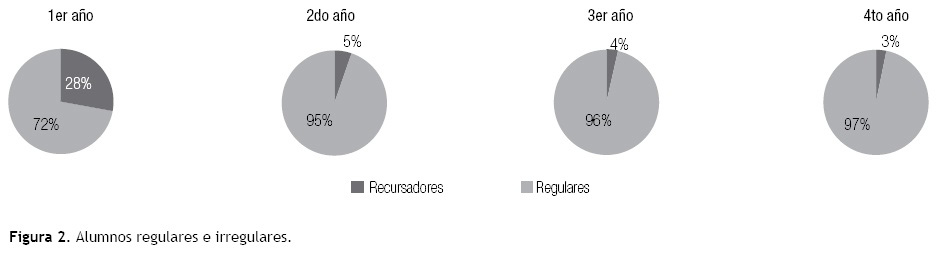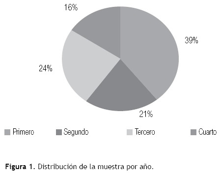 De primer año respondieron 1 309 de 1 555 inscritos (84%), de segundo 682 de 927 (73%), de tercer 806 de 850 (94%) y de cuarto año 531 de 802 (66%). La distribución de la muestra de la encuesta por año se presenta en la Figura 1. Con las bases de datos generadas se obtuvo información descriptiva, y a partir de ahí, se elaboraron tablas de contingencia para explorar asociaciones estadísticamente significativas en el uso del tiempo de los alumnos regulares e irregulares, con la prueba estadística de ji cuadrada2 (p<0.05).