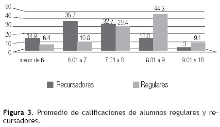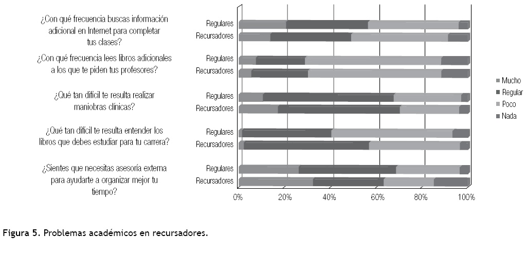 Resultados: De 3 029 encuestados, 13% fueron recursadores, de los cuales 80.7% estaban en primer año, 70.2% eran mujeres. El 50.6% tenían promedio de calificaciones menor de siete, en comparación los regulares, 17.2% (p=0.00). Se encontró asociación estadísticamente significativa (p<0.05) entre algunos problemas académicos y ser recursador, como dificultad para entender textos médicos, realizar maniobras clínicas, buscar apoyo en libros adicionales o internet, y la necesidad de asesoría para organizar su tiempo. Los irregulares se mostraron inseguros de terminar la carrera y expresaron disfrutar menos sus estudios.