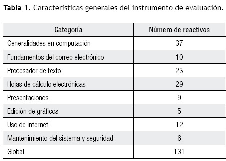 Para la realización de este trabajo se tomó como base el instrumento mencionado de la Universidad del Estado de Illinois, se realizó la traducción al español del mismo y posteriormente de nuevo al inglés (backtranslation), para verificar que se preservara el significado de los reactivos. Un grupo conformado por profesionales con posgrados en educación, informática, psicología, pedagogía y medicina, fungieron como expertos para validar el citado instrumento en nuestro medio, decidiéndose eliminar una categoría debido a su obsolescencia (manejo de diskettes) y agregándose dos categorías que se consideraron fundamentales: 1) habilidad para elaborar presentaciones y 2) mantenimiento y seguridad del sistema. El instrumento final está conformado por ocho categorías y 131 reactivos (Tabla 1). El instrumento completo, con los 131 ítems puede obtenerse de los autores.21