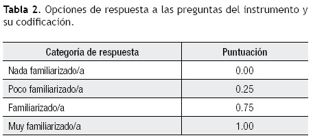 La evaluación se realizó en línea al inicio de la asignatura de Informática Biomédica I, en la primera semana de clases, durante el mes de agosto de 2010. Se utilizó la plataforma Moodle que permite diseñar y aplicar reactivos de opción múltiple. Las preguntas se ordenaron por categorías, y las respuestas de los estudiantes fueron codificadas utilizando el esquema de la Tabla 2.