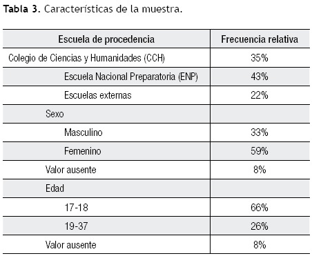 Se evaluaron 1 135 estudiantes, lo que representa una tasa de respuesta del 94.4% de los estudiantes matriculados en primer año, de licenciatura del Plan 2010 de medicina. La edad promedio de los estudiantes fue de 18.3 ± 1.5 años, y el 95% de los estudiantes tenían entre 17 y 20 años en el momento del estudio, el restante 5% corresponde a 42 estudiantes de entre 21 a 37 años. En esta muestra, 731 (64.4%) de los estudiantes eran mujeres y 404 (35.6%) hombres (Tabla 3).
