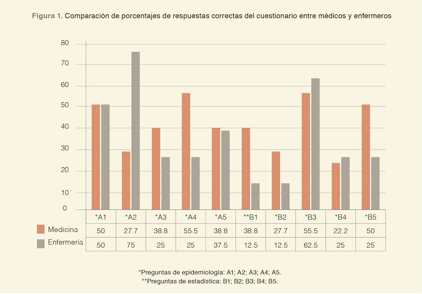 Results: Of the 26 participants; 18 were resident doctors and 8 resident nurses. Of which 21 were women and 5 men, age range 25-35 years. In relation to scientific habits 11 (42.3%) carried out some course in statistics, research methodology or epidemiology. The median of publications read was 1 per week. The number of participants with publications was 8 (30.7%). The median of correct answers was 3.5. Only 6 (23%) approved. In relation to research methodology and epidemiology both doctors (42.1%) and nurses (42.5%) had similar scores. In relation to statistics, physicians (38.8%) had a higher score than nurses (27.5%).
