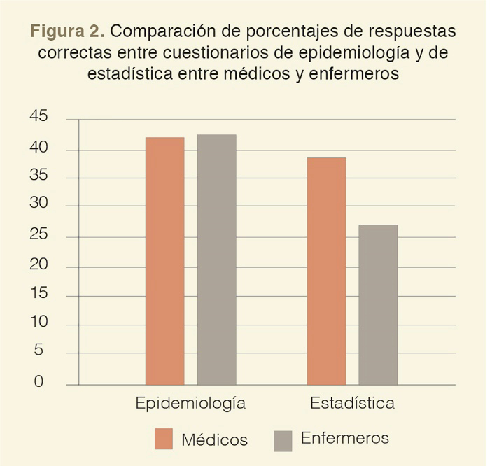El porcentaje de respuestas correctas en relación a metodología de investigación y epidemiología, fue similar; siendo (42.1%) en médicos y (42.5%) en enfermeros. En cambio, en relación a estadística los médicos (38.8%) tuvieron mayor puntaje que los enfermeros (27.5%). En la figura 2 se compararon los porcentajes de respuestas correctas entre cuestionarios de epidemiología y de estadística en médicos y enfermeros.