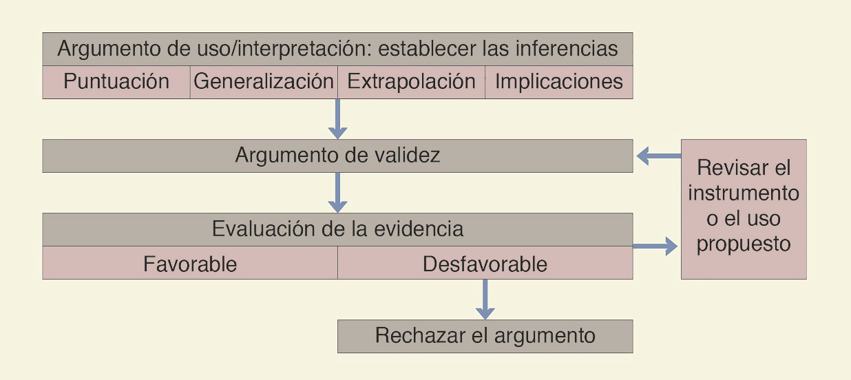 Kane consideró que, aunque la visión de Messick acerca de la validez de constructo es importante, no es fácil de evaluar, ya que no provee de guías para iniciar el procedimiento, y no es muy práctica24; por ello desarrolló su propio marco de referencia que se enfoca en el proceso de recolección de evidencia de validez mediante cuatro inferencias para desarrollar un argumento de validez.25 El planear un examen considerando las fuentes de validez marca el camino para partir de la evaluación de una sola observación (inferencia de puntuación) hacia la puntuación general del examen (generalización) y de ahí a establecer las implicaciones de la puntuación en el desempeño en la vida real (extrapolación), llegando finalmente a la interpretación de esta información y a la toma de decisiones (implicaciones).26 Una ventaja de este acercamiento a la validez es que es factible para quienes no poseen experiencia amplia en psicometría, además de que propone pasos muy claros.27