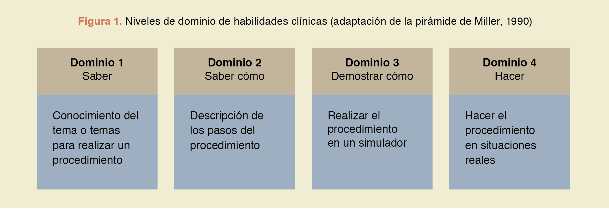 Otro planteamiento teórico relacionado con la evaluación que surgió a finales del siglo pasado, a la par de la incorporación de la Educación Médica Basada en Competencias (EMBC), es la denominada pirámide de Miller7 que buscó resaltar la complejidad de las habilidades clínicas y describir cómo los estudiantes transitan en su desarrollo (figura 1). Este autor recomendó utilizar diversos métodos en la evaluación de las capacidades de un médico, pues ninguno por sí solo permitía obtener información suficiente para juzgar el ejercicio de esta profesión. Es así que categorizó los niveles de dominio de las habilidades clínicas con la intención de contribuir a la sistematización. La pirámide constituye un marco teórico que dio pauta a estructurar los métodos de evaluación existentes y definir el nivel de dominio que cada uno valoraba. Significó una innovación conceptual que detonó nuevos abordajes en la valoración de las capacidades del médico y, a la fecha, orienta la selección de los métodos más pertinentes a cada situación8.