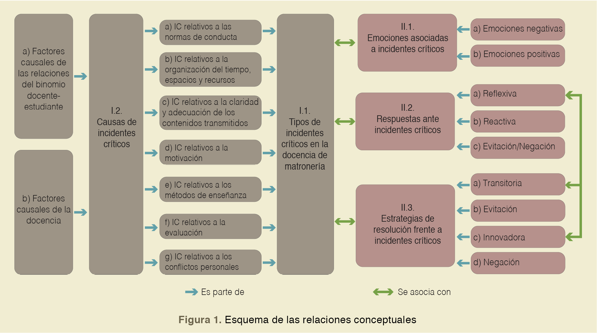 Resultados: Veinte profesionales participaron en la investigación. Se identificaron 45 incidentes críticos, 30 en el aula y 15 en los campos docente-asistenciales, con predominancia en las normas de conducta. Las respuestas que más mencionaron las docentes fueron de tipo reflexiva y reactiva. Las reflexivas ofrecen una solución adecuada al emplear estrategias de afrontamiento transitorias, pero no necesariamente logran un cambio significativo en su identidad como docentes, a diferencia de las estrategias innovadoras que abren la puerta a una re-conceptualización de sus concepciones, prácticas y emociones asociadas a la docencia.
