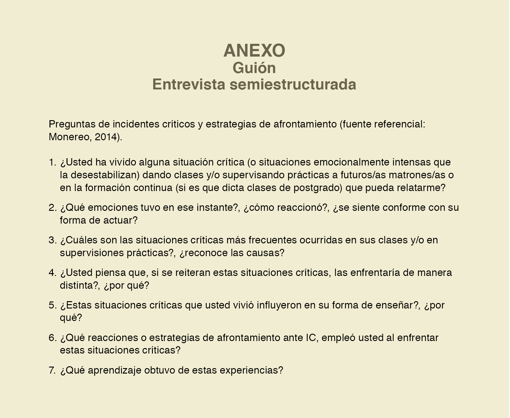 Los datos se recolectaron por medio de entrevistas semiestructuradas con una extensión de 45 a 60 minutos. Esta técnica permitió reducir formalismos21 e indagar directamente en el grupo de interés sobre emociones, reacciones, estrategias de solución, y aprendizaje sobre los incidentes críticos, con el uso de un guion de tipo abierto (anexo).