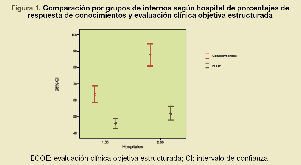Results: The results showed that the group of hospital two had a better response in the objective structured clinical evaluation, obtained 23.86 more percentual points in knowledge (p 0.000 95% CI –33.07 to –14.63) and a difference of 15.02% in the rubric (p 0.000 95% CI –20.68 to –9.35) in relation to the group of hospital one.