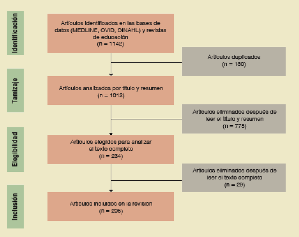 Se realizó una revisión sistemática5-7 de la literatura publicada en las bases de datos MEDLINE, OVID y CINAHL, además una búsqueda en las siguientes revistas de educación médica: Medical Education, Medical Teacher, Medical Education Online, Anatomical Sciences Education, BMC Medical Education, Advances in Physiology Education, Teaching and Learning in Medicine, BMJ Postgraduate Medical Journal y la revista Investigación en Educación Médica.
