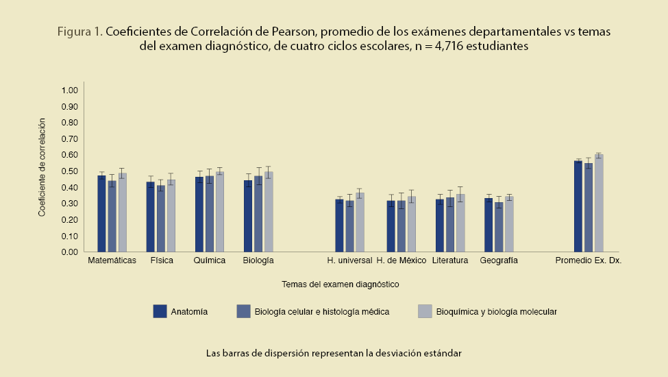 El primer año de la licenciatura de médico cirujano (LMC) es el que define el progreso académico del estudiante, ya que implica varios ajustes y, en especial, el examen diagnóstico –una prueba para evaluar los antecedentes académicos previos del estudiante al ingreso a la universidad–1,2. Se reporta que existe una correlación entre las calificaciones obtenidas en los exámenes departamentales de las asignaturas de primer año de la LMC y la calificación obtenida en el examen diagnóstico de conocimientos al ingreso a la Universidad Nacional Autónoma de México (UNAM). Hay estudios que informan de un 2% a un 26.2% de deserciones y estas se han relacionado con bajo desempeño en los exámenes de selección3.