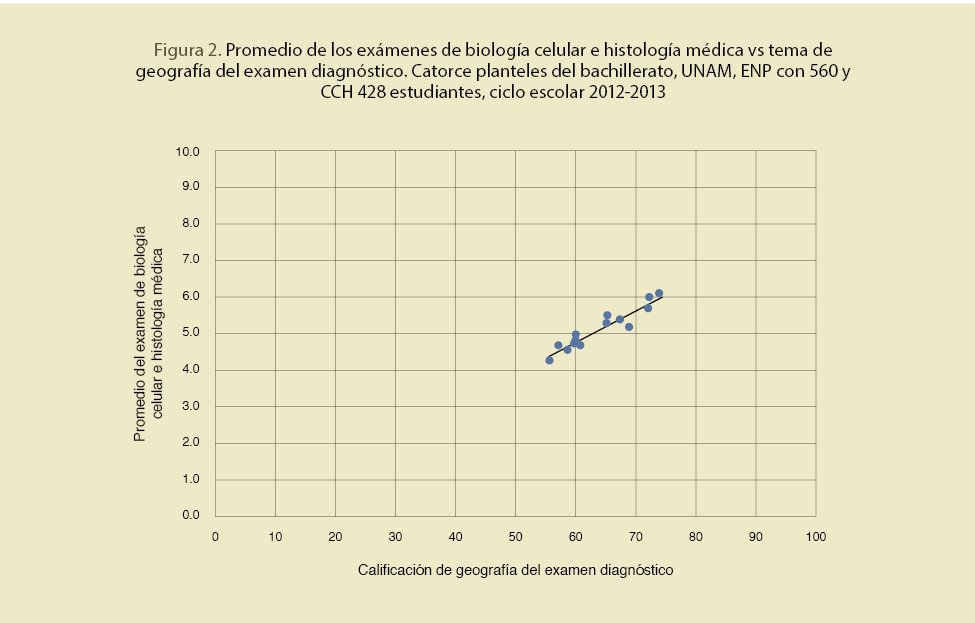 Segundo nivel: Se consideró a los 9 planteles de la ENP y 5 del CCH, como unidad de estudio. La correlación calculada de los 14 planteles del bachillerato UNAM, fue del promedio de los exámenes departamentales frente al promedio del examen diagnóstico, (tabla 1 y figura 2).