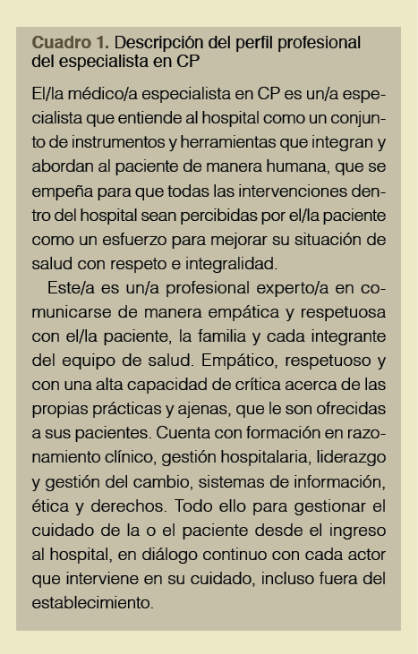 Resultados: Un especialista en CP entiende al hospital como un conjunto de instrumentos y herramientas que integran y abordan al paciente y que utiliza para gestionar su cuidado desde el ingreso y continúa incluso fuera del establecimiento.