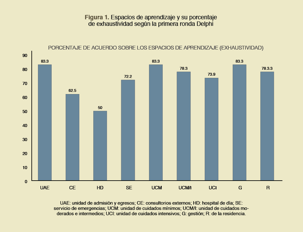 El objetivo de la primera ronda fue identificar la representatividad y la indispensabilidad de cada APC, consideradas como tal aquellas que alcanzaron o superaron el 70 % de acuerdo. A su vez se evaluó la exhaustividad de cada espacio de aprendizaje. Se definió exhaustividad como la cantidad y relevancia de actividades propuestas en dicho espacio. Los espacios de aprendizaje han sido seleccionados como el escenario de práctica, donde el aprendiz puede y debe desarrollar las APC, en función de la unidad de cuidado que el paciente requiere en su tránsito por el hospital.